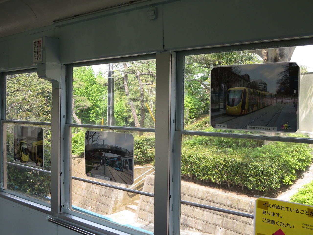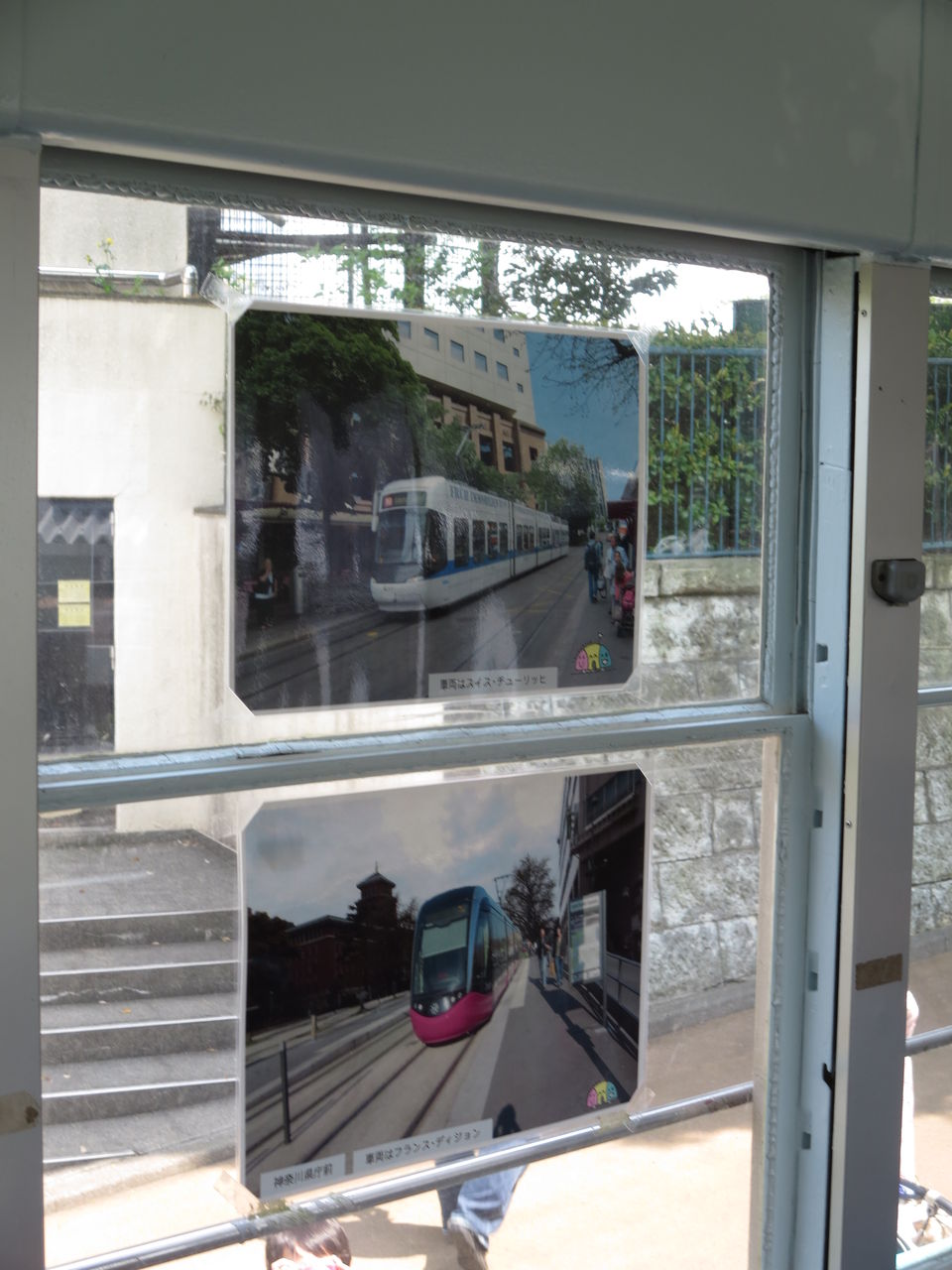 続いては路面電車内の写真を、とは言え電車内なのでうまくとるのは難しく申し訳ないですが上の2枚だけ、実際はもう少し写真があります。左は横浜駅・日本大通り、右は県庁前にフランス・スイスのLRT車両が走っています。もともとが今の写真と言うのもありますが全体的にカラフルなのが印象的です。車体がカラフルなのはヨーロッパだけの傾向かと言うとさに非ず、日本国内でも高岡や富山、広島をはじめとした新車が導入されたところではこういった傾向も引き継いでいます。ただこういったカラーリングは気候によって映える色が左右されるので横浜にはどんなカラーが似合うかを考えながら見るのも面白いかもしれません。