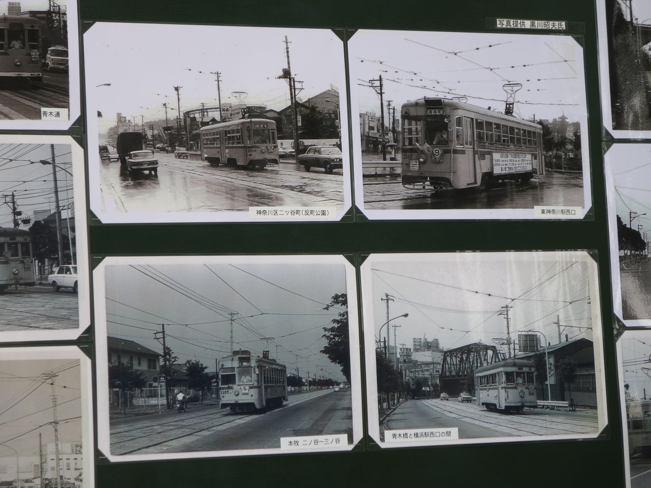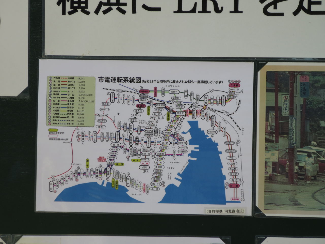 さて入口側から見ていきます。入口側の3枚のパネルは1972年まで走っていた旧横浜市電のコーナー(正式には横浜の昔の路面電車展)、白黒写真も多くなかなか渋いチョイスが目を引きます。目立つのは全盛期の横浜市電の路線図、主に都心・京浜地区、南部・保土ヶ谷方面を中心に稠密に路線網が形成されていたのがわかります。また写真では麦田のトンネル等の市電の名物スポットや70年代以前の横浜駅前など今からみるとびっくりするような光景が見受けられます。