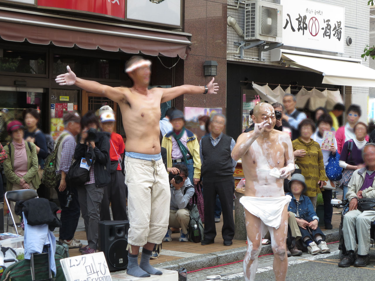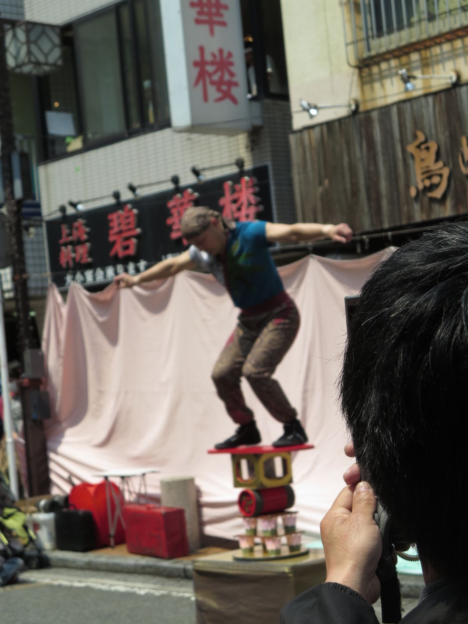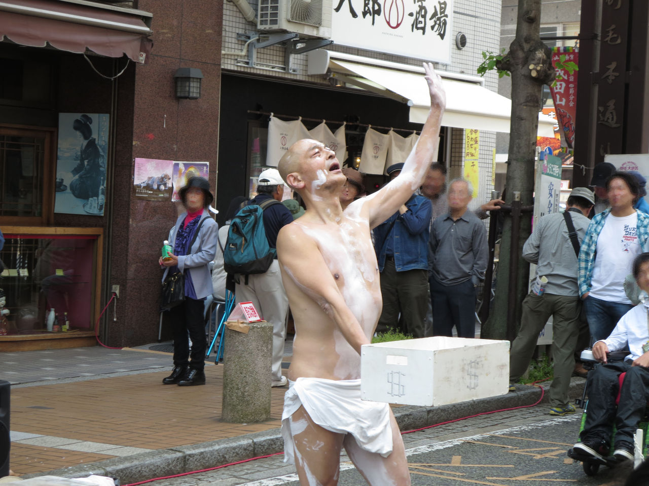 続いて道路を渡って本通り会場に、こちらでは雪竹太郎氏による人間美術館なるパントマイムショーが行われていました。しかしのっけから自販機の上に乗っかるなどアクティブ、かつコミカルな展開が印象的でした。