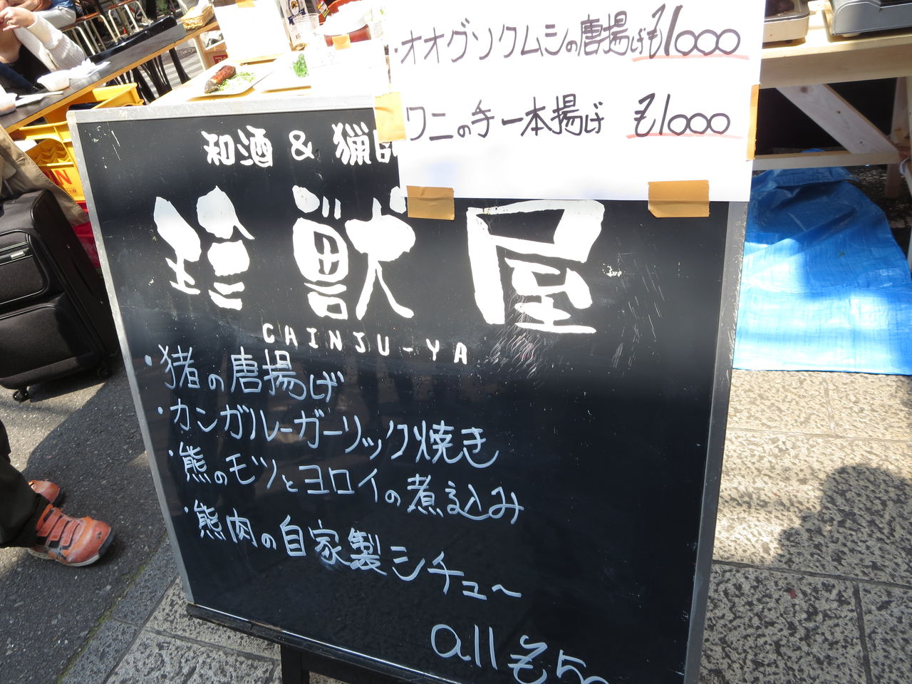 さて裏通りを進むと野毛野々宮さんによる屋台街が見えてきます。元々野毛は飲み屋さんの街、普通の居酒屋さんが焼き鳥やお酒の屋台を出していたり、イノシシの空揚げや熊肉のシチューなどが食べられるその名も珍獣屋の屋台があってみたりとらしい屋台が続いています。
