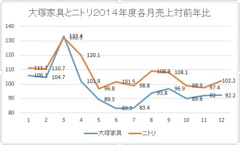 グラフ:大塚家具・ニトリの2014年度各月対前年売り上げ比較(各社月次データ参照)