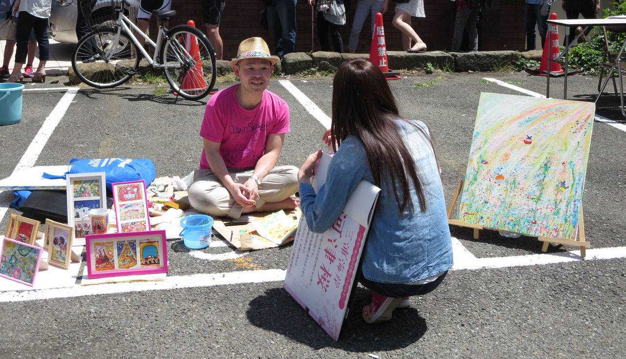 続いては横浜大道芸の名物と言っていい、観客に出てもらっての展開、いわゆる客いじりのっけから上半身裸と言う飛ばしっぷりで、最終的には5人くらいの観客の協力で作品が完成した際には多大なる拍手が巻き起こったのは言うまでもありません。