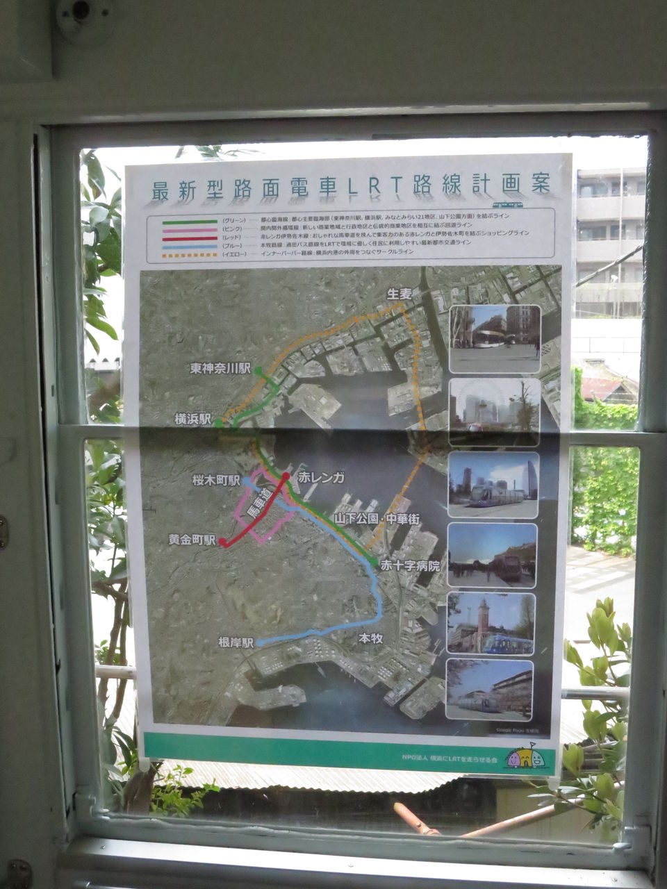 続いて車内では主催である横浜にLRTを走らせる会による走らせる会作成の都心部の路線計画案とLRTに関する解説があります。路線計画案は基本的に横浜市の公式なものではなく横浜にLRTを走らせる会による走らせる会の独自研究によるものですが1路線だけ中田市長時代に検討されたインナーハーバー構想で検討された路線も入っています。インナーハーバー構想自体が50年後を目途とした長期計画なので都心臨海部再生マスタープランとはそれほど関連のある訳ではないです。あと路面電車に詳しい方だったらわかると思いますが、この色分けされた路線=系統ではないので例えば伊勢佐木町方面〜本牧方面と言う系統や急行運転もありうるなどと考えるとより楽しんで見れるのではないかと思われます。