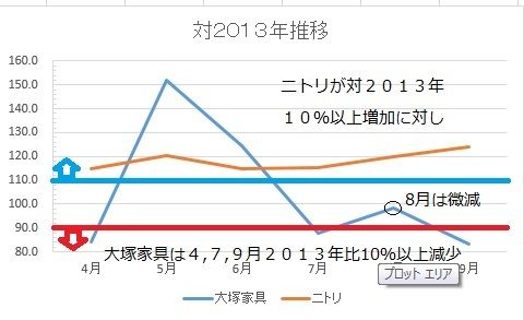 さてそれを踏まえて次に月次情報をニトリと比較して見ていきます。これを見るとニトリがおおむね2013年比15%以上の増収で推移しているのに対し、大塚家具はセールのあった5,6月を除くと2013年比マイナス、特に4月7月9月は10%以上の減収となっているのが目立ちます。5,6月の好調を騒動で来店を手控えていた顧客が1時期に集中したこと、あるいは騒動で興味を持ったお客さんによる1時的な現象と考えると実は4,7,9月の消費税増税前から15%売り上げが減少し、それがなかなか戻らず更なる減少も見込まれると言うのがが今の大塚家具の置かれた状況なのではないでしょうか?