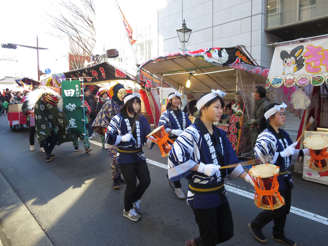 前橋の年の初めを飾る1月9日の「初市まつり」、だるまや縁起物など多くの露店が並び、例年夜遅くまで多くの人で賑わいます。初市まつりは、六斎市として毎月4と9の日に開かれた日用雑貨や生糸の市が起源といわれています。厩橋(現在の前橋)城主、酒井重忠候の時代(1600年代初め)から続く伝統ある行事で、別名だるま市とも呼ばれます。まつりは本町の八幡宮境内で午前10時からの神事と市民の皆さんから持ち込まれた古いだるまを燃やす「お焚き上げ」で幕を上げます。10時半ころ八幡宮から「市神様」の渡御行列が出発、木遣りや神輿、天狗や大獅子などの行列が中心商店街を練り歩き、東和銀行本店前(憩いの広場)の仮宮まで行進します。国道50号の本町通りは完全交通規制され、中心商店街全体に市が広がり、だるまや招き猫、さまざまな縁起物、また植木などの露店6百店あまりが出て、縁起物を買い求める人達でごった返します。買い手の値切る声と露天商との威勢のいいやりとりが深夜まで絶えません。