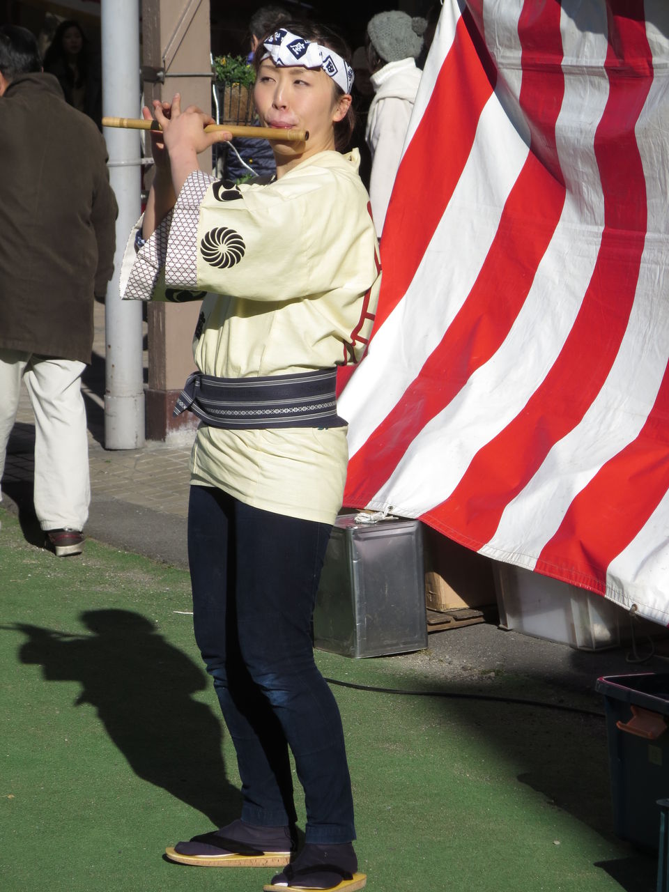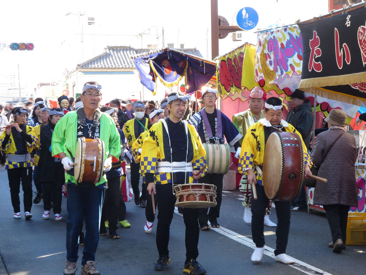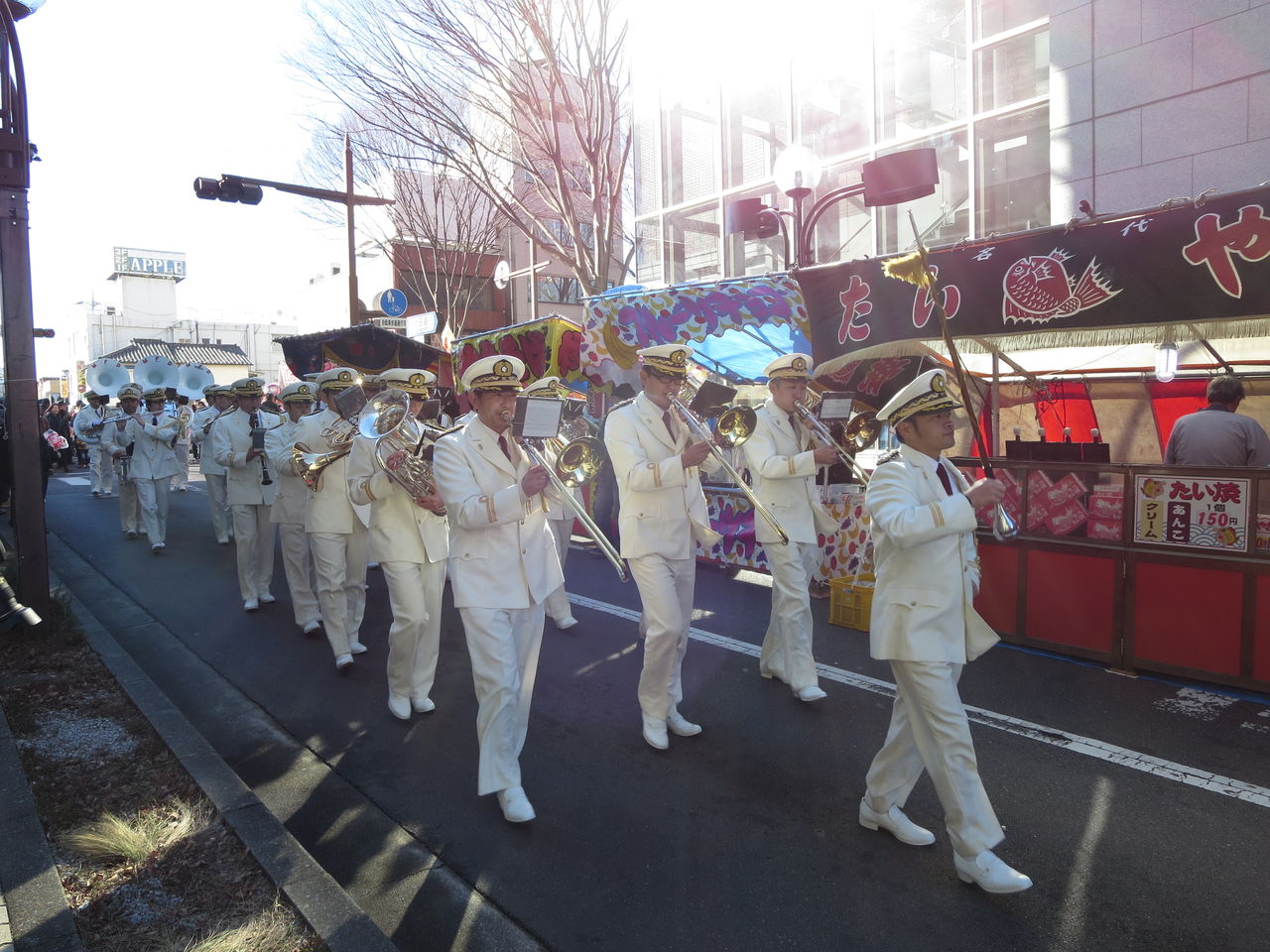 続いて市神様の御渡行列と言うパレードが街中を練り歩きます。このパレードはダルマの供養と言う大仕事を終えた八幡宮の神様が街なかの仮宮へ移動する行列です。先導は消防音楽隊のブラスバンドと消防団と思しき若い衆です。