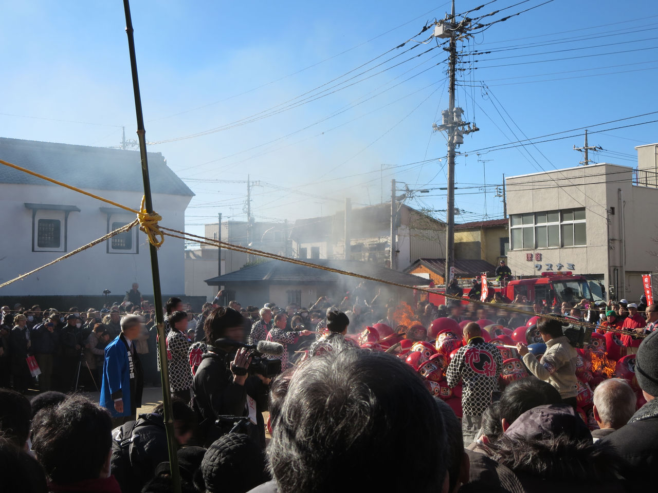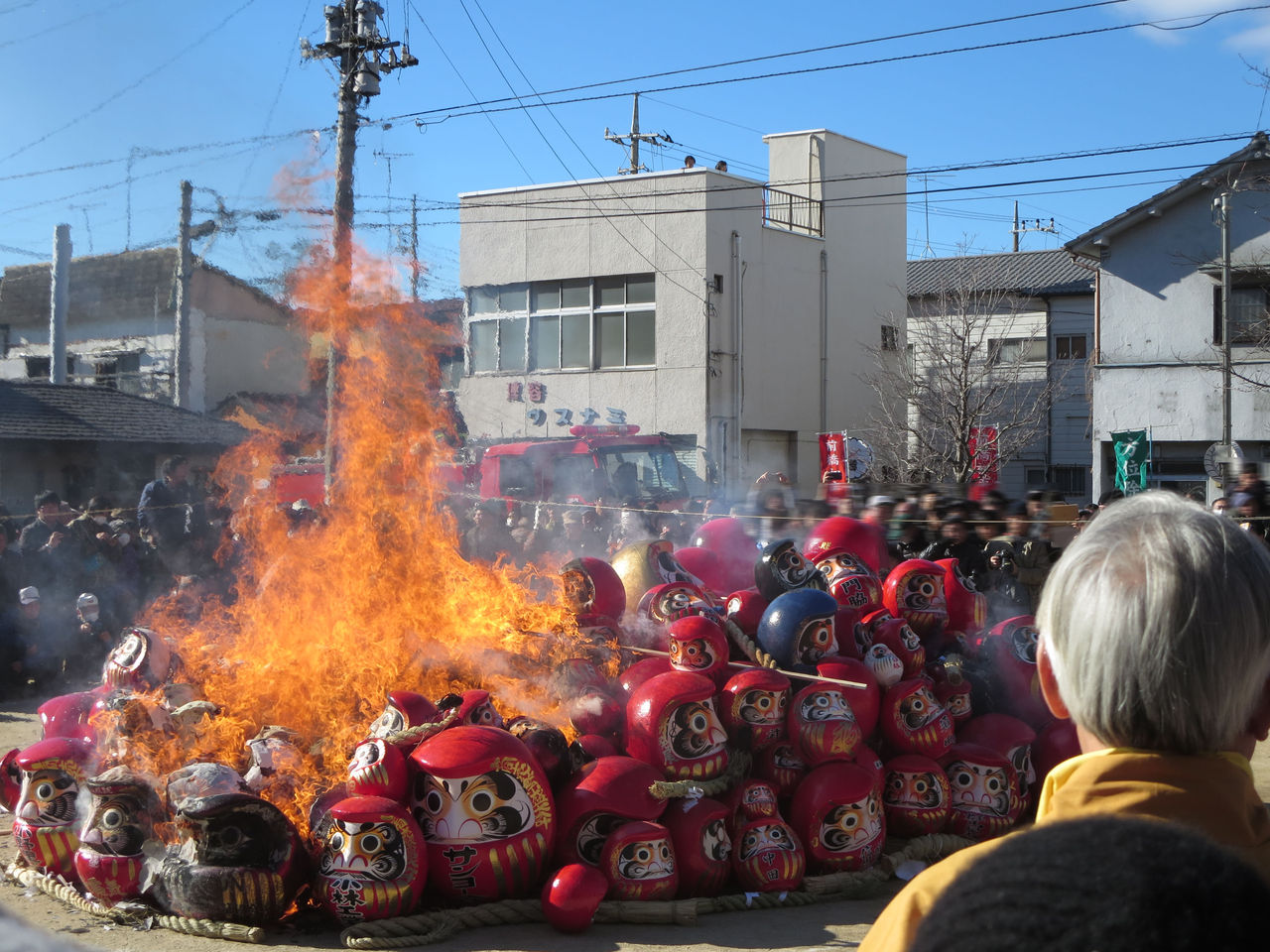 そしてお焚き上げに向かいます。決して広くはない八幡宮の広場に積み上げられたダルマたちに火がかけられます。願い事をかなえ両目を開いた状態で燃やされるのは達磨の本懐を果たしたという事でその煙にはご利益があるので、その煙を浴びるべく多くの人が構えているのが印象的でした。