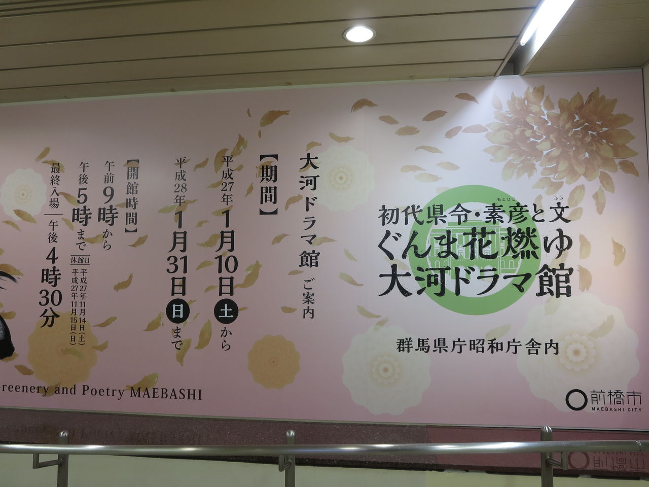 さて駅で目立ったのは上の写真にあるように県庁に設けられた昨年の大河ドラマ「花燃ゆ」を記念して設けられた大河ドラマ館の広告とまちなか回遊バス、群馬県にとっては過去5年で「八重の桜(主人公の夫が群馬出身)」、昨年の「花燃ゆ(後半戦の舞台)」、今年の「真田丸(沼田が主人公の兄信之の領土だったり、他勢力との争いで重要な存在になる)」と3回メインとは言えませんが主要な舞台になっているのですが、この「花燃ゆ」は初代県令(今の県知事)が準主役になるという事(ただし街なか回遊バスは前橋市の運行)で気合が入ったようです。