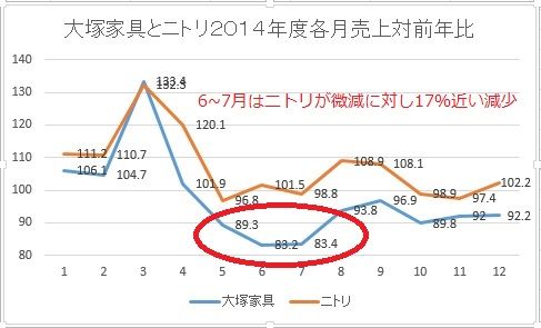 さて2年連続の赤字やアベノミクスでの高額商品売り上げ増の取り込み失敗などに目をつぶって久美子社長を育てようとしていた勝久氏ですがそれでも我慢の限度を超えたのは何故でしょう。久美子社長が解任された2014年度の業績を見ていきます。消費税増税後、特に久美子社長解任時期ともいえる6・7月の売り上げが17%近い減少となっているのが目を引きます。ちなみに同業種のニトリはこの時期微増・微減を行ったり来たりで消費税増税の影響を最小限にとどめています。