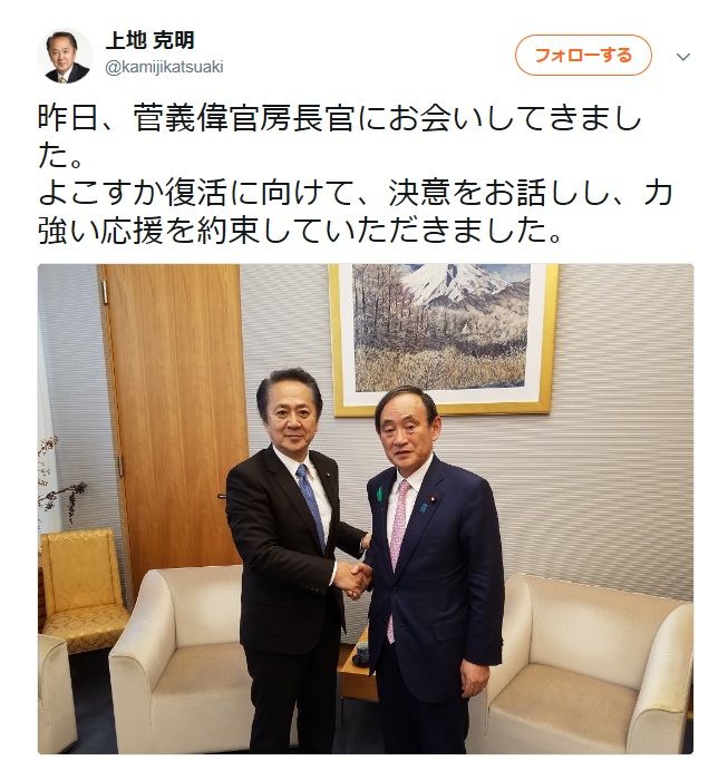 小泉進次郎Facebook6/27よりさて先代純一郎元総理の頃から自ら支援した候補が吉田市長に敗れている小泉進次郎代議士、初めて自分が支援した市長候補が当選した事に喜んでいるようです。ただ個人的にはこの選挙に関して言えば進次郎氏はある種背筋が寒い思いをしたのではと思っています。横須賀市長選挙、上地克明さんが当選しました。応援ありがとうございました。
