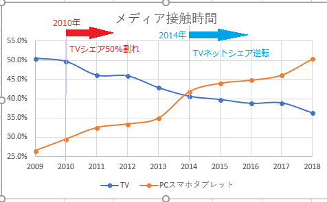 2009年にはTVのシェアは50%を超えていたのがわかります。しかし翌年の2010年には50%を割り込み、2014年にはPC・スマホ・タブレットのネット3メディアにシェアで逆転され今年の調査ではPC・スマホ・タブレットのデジタル3メディアが逆に50%を超えています。