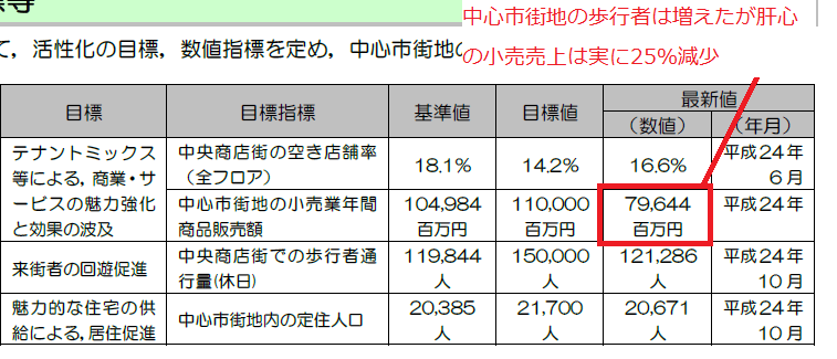確かに空き店舗率、通行量、定住人口それぞれ、増えています。それは確かなのですが、肝心の小売業販売額は6年で24.1%減少、計画段階では7年で23%減少なのでむしろ小売りの売り上げ減少のペースはむしろ加速しているのです。地方創生のメインの目的が「地方における安定した雇用の創出」と考えると最も重要な指標が改善は愚か悪化していると考えると成功と言い切るのはどうかと思います。