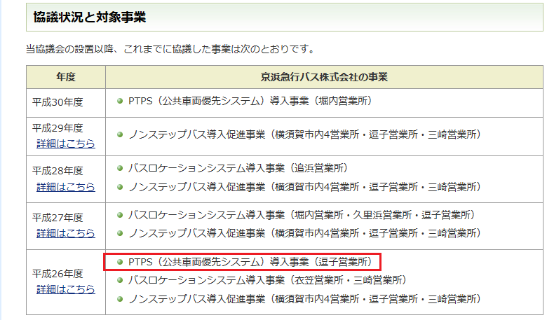 三浦半島生活交通ネットワーク計画協議会とは@横須賀市土木部交通計画課さて聞きなれない用語が出て来たので少し解説を、三浦半島生活交通ネットワーク計画協議会とは国の地域交通の補助金を受けるために「生活交通ネットワーク計画」を立てる必要があるので、それを行うための協議会を横須賀・逗子・三浦・葉山の3市1町共同で行っているものです。事業内容としてはノンステップバス・バスロケ・PTPSの導入などをこの地域では行っています。PTPSとは、交通管制システムとバスロケを有機的に結合しバス優先信号、運行管理支援、所要時間表示などをリアルタイムで行うシステムです。葉山のPTPSは2015年度に導入されたようです。三浦半島生活交通ネットワーク計画協議会では今年度堀内営業所内でもPTPSを導入しようとしている為今後に期待したいところです。