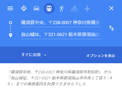地方のバスに関しては自前で進める必要があるのですが余裕のない地方のバス会社ではなかなかそれが出来ず、例えば上は横須賀中央駅から栃木県那須烏山市の烏山城址までのグーグルでの検索結果です。実際はJRの烏山駅から那須烏山の市営バスでのアクセスが一応可能なのですが、GTFSのデータが公開されていないのでバスの存在が検索サイト上ではないものとされるのです。これでは地元でバスを利用することの多い人はいいかもしれませんが、地元でもバスを利用することがほとんどない人、あるいはよそから訪れる人にとってはバス以前に公共交通そのものが選択肢に入らなくなるわけです。