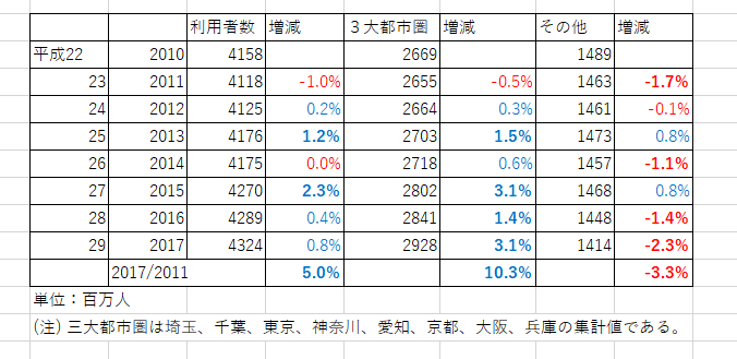 まず2010年代のバスの利用者数の推移に関して見ていきます。国土交通省自動車関係統計データと言うバスの利用者数の統計を見ますと、全国では東日本大震災のあった2011年を底に増加傾向にある事がわかります。しかし特に消費増税のあった2014年度に全国で減少に落ち込み、2015年度に揺り戻しがあったのですが、それ以降で見ると東名阪の3大都市圏で増加のペースが年1.4%以上とハイペースになっているのに対しその他の地方圏では1.4%以上の減少と明暗を分けています。