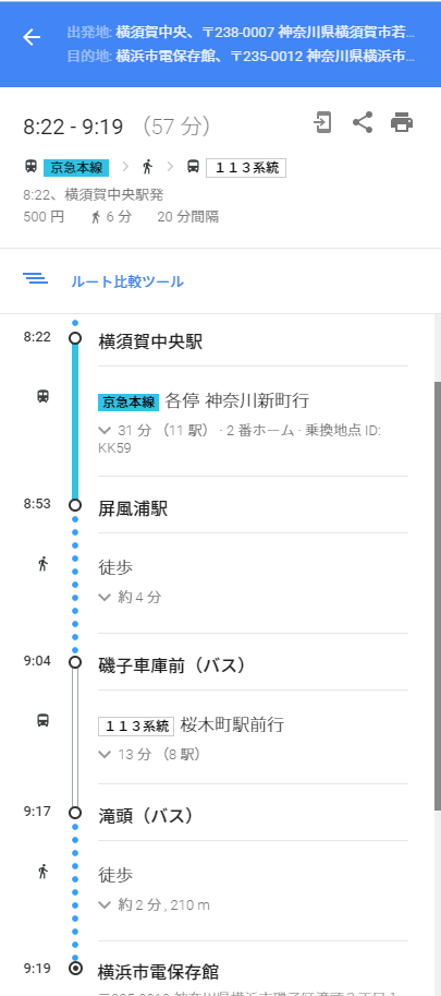 ただしその為にはGTFSと呼ばれるフォーマットに対応したバス停、運転時刻のデータを公開する必要があります。もともと時刻表で案内がある鉄道や利用者の多い3大都市圏のバス会社のデータは間に時刻表を作成する会社が入ったりしてスムースにそれが進みました。上は横須賀中央駅から横浜市の市電保存館へのアクセスをグーグルマップで検索したものですが、実際京急屛風浦駅から横浜市営バス磯子車庫まで歩いて市営バス113系統で滝頭バス停まで行って歩くというかつてだったらマニアしか思い浮かばないようなバスの乗り換えもきちんと案内されていることがわかります。