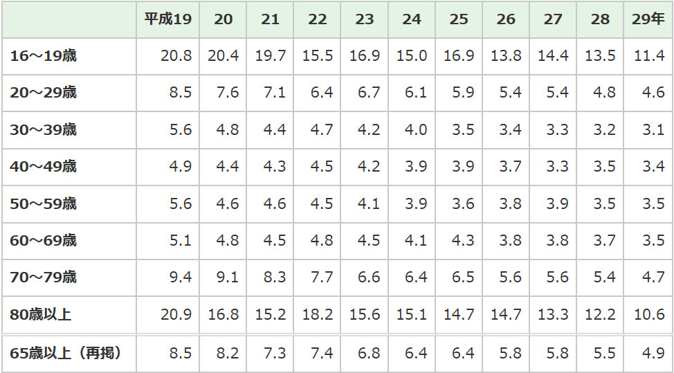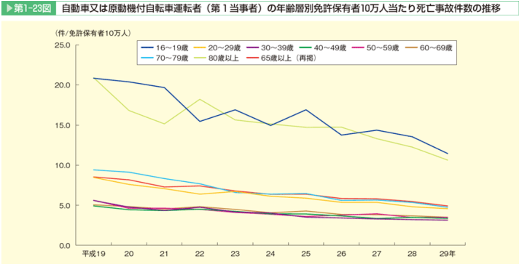 しかし冷静になって高齢者の事故率を見ていくと意外なことに気づきます。上は年齢階層別の人口10万人当たりの死亡事故件数、確かに70歳以上の高齢者の事故率は高いですが、80歳以上は16〜19歳を下回り、70〜79歳は20〜29歳世代と同程度であること、平成19年と29年の比較でみれば70〜79歳が9.4→4.7と半減、80歳以上は20.9→10.6とほぼ半減していて他の世代よりも減少していることが見て取れます。平成29年の70代の死亡事故率は、平成19年のどの世代よりも低くなっているというのは注目されてもよいと思います。確かに高齢者の身体能力は衰えていくのかもしれませんが、一方で経済力を生かして新しい安全性能の高い車の導入を積極的に行うことでその衰えをカバーしたということなのでしょう。