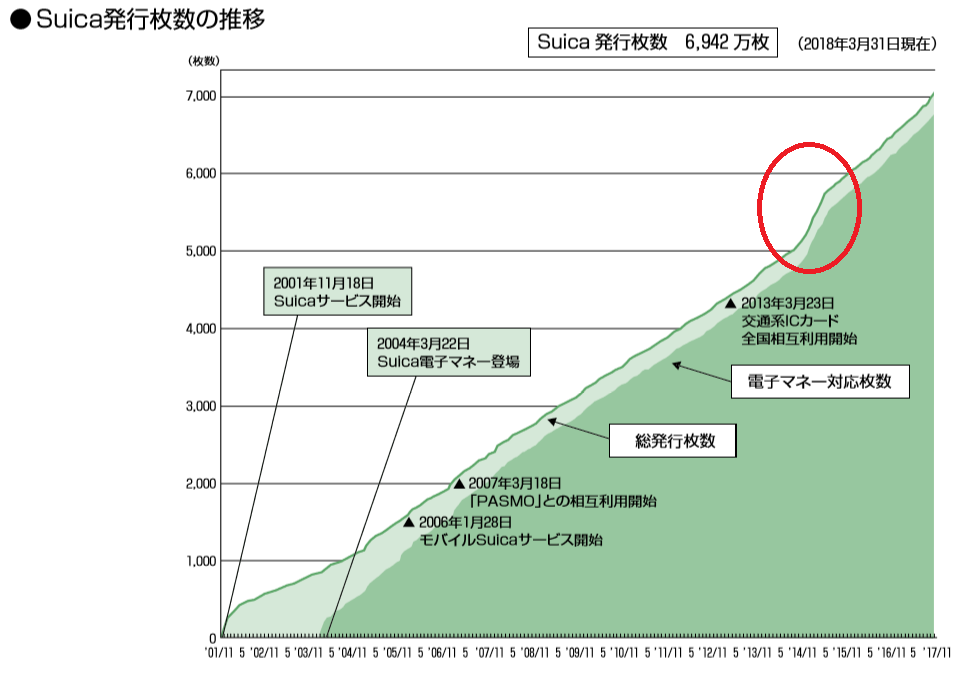画像:Suica発行枚数推移(JR東日本会社要覧2018-2019より作成)