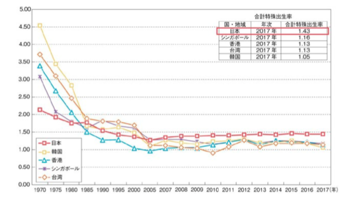 画像:アジアの出生率推移(令和元年版少子化社会対策白書より)