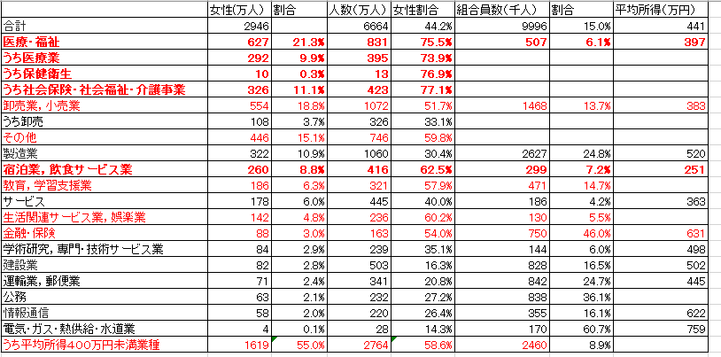 上の表は様々なデータが混ざっていますが、業種別の女性就業者数、就業者人口、労働組合員数、所得と各種割合です。このデータから以下の事が見て取れます。