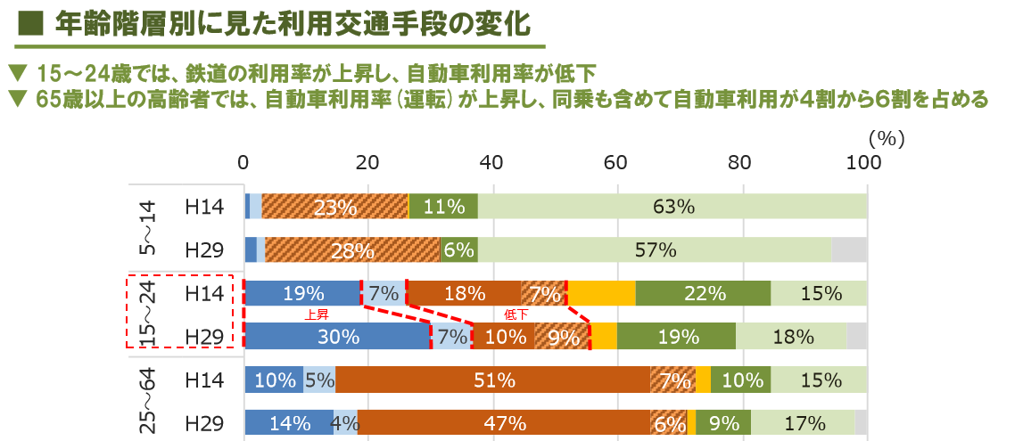 ただ40代以下に関しては少しづつ意識が変わっているように感じます。上は北関東ではなく東北地方の都市圏の交通に関する調査結果(ちなみに群馬県でも同様の調査が行われているが前回が1993年と古すぎる為仙台のものを使用)のものですが15〜24歳に関しては自動車のシェアが25→19%と急減し、25〜64歳の現役世代で見ても58→53%と減少しています。仙台市は前回の調査との間に地下鉄の新線が開業があったからとも言えますが、人頭税の負担に耐え切れなくなっている若い世代・現役世代があり、彼らがその人頭税から逃れるために有用なのが公共交通なのが見て取れます。
