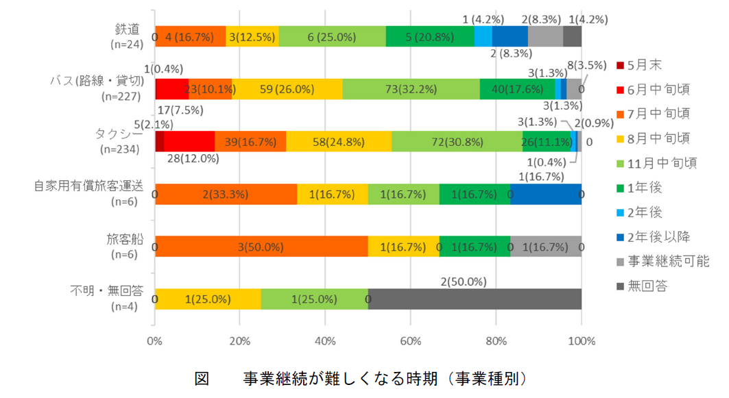 図:事業継続が難しくなる時期(事業種別)(【緊急調査】全国交通事業者アンケート 〜半数が8月中旬ごろには事業継続困難に〜@一般社団法人日本モビリティ・マネジメント会議(所在地:京都市、代表理事:藤井聡京都大学教授、以下JCOMM(読み:ジェイコム))より)