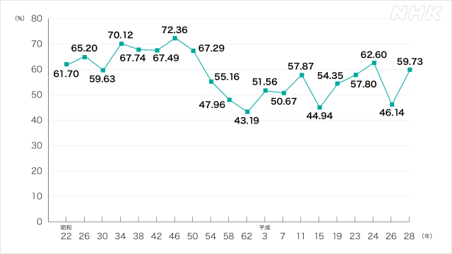 グラフ:都知事選投票率推移(NHK特集ページより)