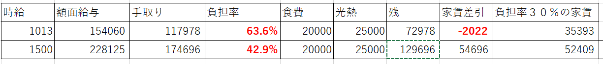 さてこれまでの計算をまとめると上のようになります。時給1013円、1500円のケースでは妥当な家賃を出すために収入の30%の額を算出しました。そしてそれらから妥当な部屋を探すと以下になります。