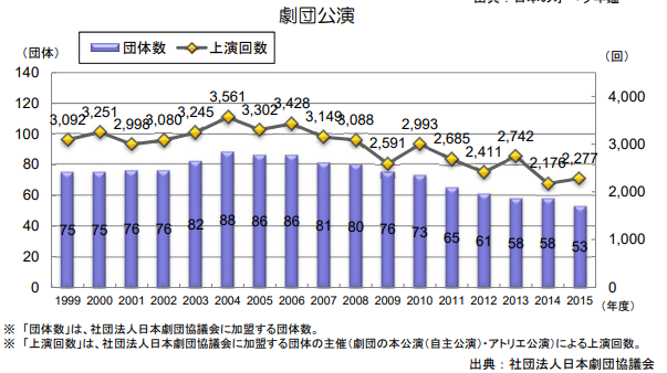 さて当記事では神田沙也加さんの副業になる舞台演劇の業界はどうなっているのでしょうか?まず演劇全体の状況を文化庁のデータで見て見ると、彼女がデビューした2004年をピークに右肩下がりです。社団法人日本劇団協議会参加団体と言うくくりではあるのですがコロナのコの字もなかった2015年段階で2004年から公演数は37%、劇団数は39%と大きく減少し全盛時の6割程度になっています。