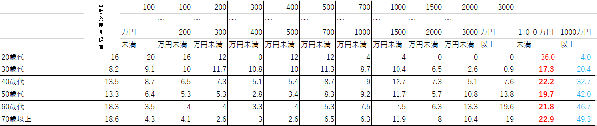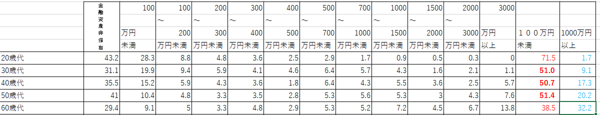 表:令和2年度年代別資産額(上:2人以上世帯、下:単身世帯、各種分類別データ(令和2年) ― 家計の金融行動に関する世論調査[二人以上世帯調査](平成19年以降)|知るぽると (shiruporuto.jp)、各種分類別データ(令和2年) ― 家計の金融行動に関する世論調査[単身世帯調査](平成19年以降)|知るぽると (shiruporuto.jp)より作成)