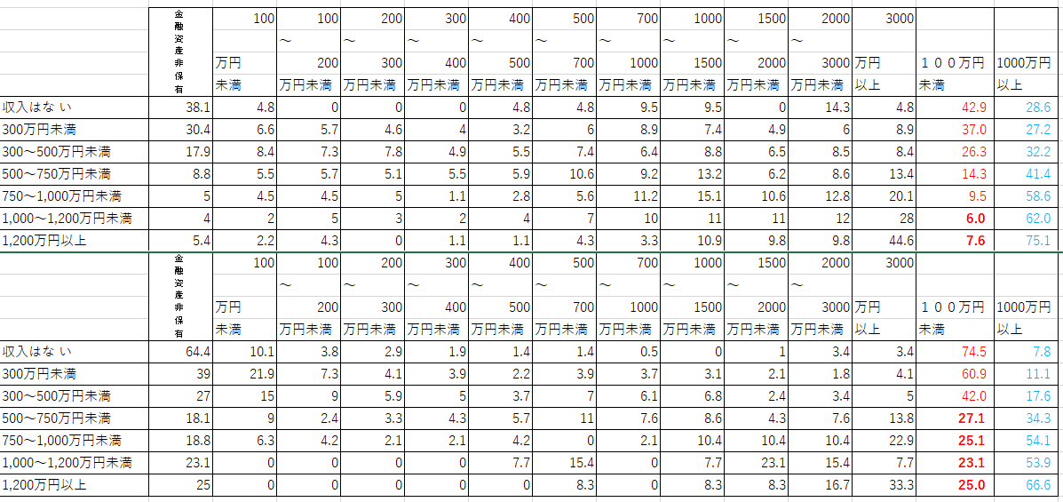 続いて収入と資産額についても見ていきましょう。こちらに関しては確かに年齢に比べて収入が多ければそれだけ資産額100万円未満になるケースは減りますし、資産1000万円を超えるケースも増えます。とは言えそれでも資産額100万未満で年収1000万円以上でも2人以上世帯で6%、単身世帯だと23.1%以上と年収1000万円以上あっても自然にお金がたまり資産形成できるわけではなく、やはり100万円と言う資産形成の第一歩を踏み出す必要があるのが見て取れます。