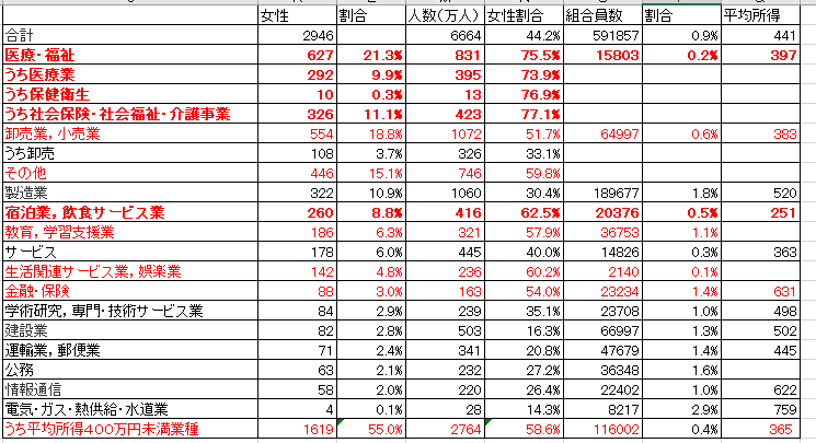 表:業種別賃金と従事者における労働組合員比率及び女性就業者数(平成30年民間給与実態統計調査@国税庁 平成30年 労働力調査年報 平成30年労働組合基礎調査の概況より作成)