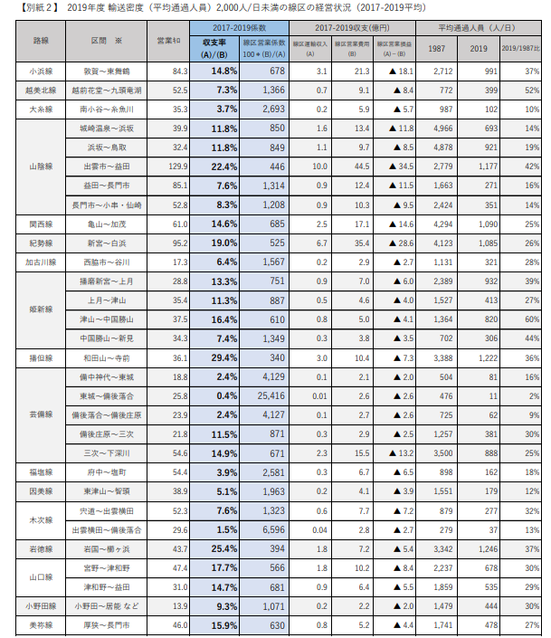 ・2017〜2019収支:-2.0億円(芸備線備中神代〜東城、小野田線)〜-34.5億円(山陰線出雲市〜益田)