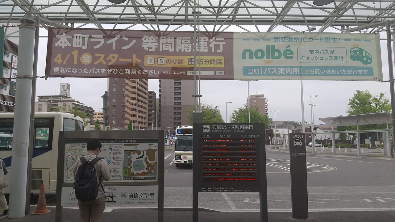 そして永井運輸東大室行バスに乗って前橋駅に戻ります。前橋駅から見て南や東方面へ向かうバス路線の中には前橋公園〜県庁〜本庁〜前橋駅〜各方面へ向かうバス路線も少なくなく、地元の人がまちなかや県庁・市役所へ向かう際直行して便利な反面一見さんには少々わかりづらかったわけですが今回の「本町ライン」で少し緩和されそうです。