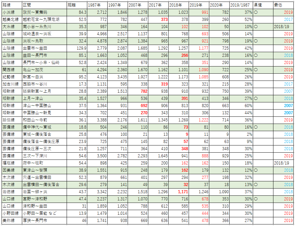 ・2019/1987比:2%(芸備線東城〜備後落合)〜姫新線(津山〜中国勝山60%)