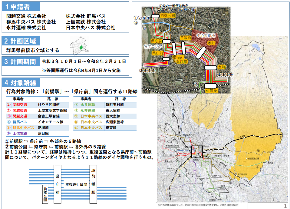簡単に言えば前橋駅前から前橋中心部、県庁方面へ行く関越交通(株)、(株)群馬バス、群馬中央バス(株)、上信電鉄(株)、永井運輸(株)、日本中央バス(株)の6社11路線バス路線の間隔を調整して最大でも15分待ちにするようです。実際私の地元横須賀市でもバス会社は京急バス一社ですが横須賀中央駅〜横須賀駅等様々なバス路線が集中していて団子状態になったりするので面白い試みではないかと思います。