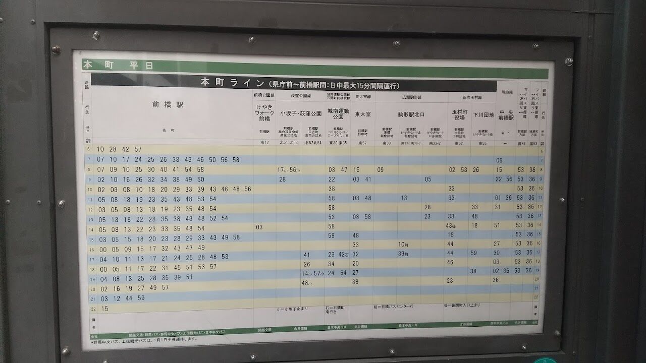 さて本町バス停に戻ってバスを待ちます。バス待ちの間に「本町ライン」の一員である群馬中央バスの高崎駅行が通り過ぎていきます。そしてバス停の時刻表を見ると前橋駅を通るバスが「本町ライン(県庁前〜前橋駅間:日中最大15分間隔運行)」の表示の下案内されていました。実際前橋駅2番乗り場の渋川方面へのバスも含みますがコンセプトとしては正解で前橋へは早朝から深夜まで多くの本数運行され前橋駅行以外にも多くのバス路線が前橋駅を通る事が一目でわかります。