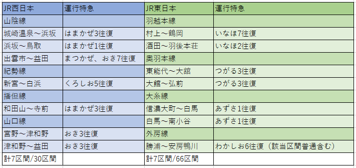 表:JR東日本、西日本の輸送密度2000人未満として発表しているかつ特急運行区間(参考:JTB時刻表2022年4月号)