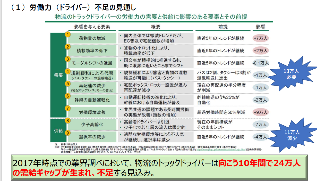 そしてもう1つ忘れてはならないのは仮に鉄道貨物をトラック輸送で代替と言うのは令和の時代では通用しづらい概念であるという事です。ドライバーの高齢化が進みかつ若い世代には底辺職として嫌われている状況で2020年代中盤には幹線の自動運転化を盛り込んでなお24万人ものドライバーが不足する見込みであり、災害時簡単に道路輸送に切り替えるのは難しいという事です。女性の活用や自動運転の大きな発展により解決する可能性は無しとは言えないですが、言うなれば戦争末期の松根油と言えるでしょう。