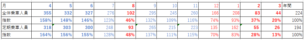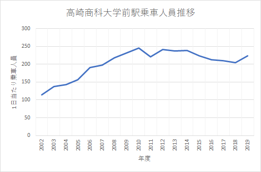 さてそんな高崎商科大学駅ですがどれくらい効果があったのでしょうか?最初のグラフでの最新年度2019年度の利用者数を少し細かく見ていきます。高崎市の統計季報での1日当たりの乗車人員は全体で224人、定期客で194人となっていますが定期客だけで見ると4〜6月が通期の1.5倍以上である300人を超えている反面、8,2,3各月が50%を割り込んでいます。言って見れば新入生が入学した4月をピークに夏休みなどで学生の免許取得で少しずつ下がる傾向はあるものの夏休み・春休み等の長期休暇では大きく利用が落ちると言った感じでしょうか?
