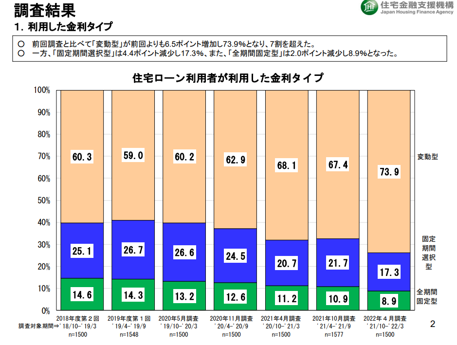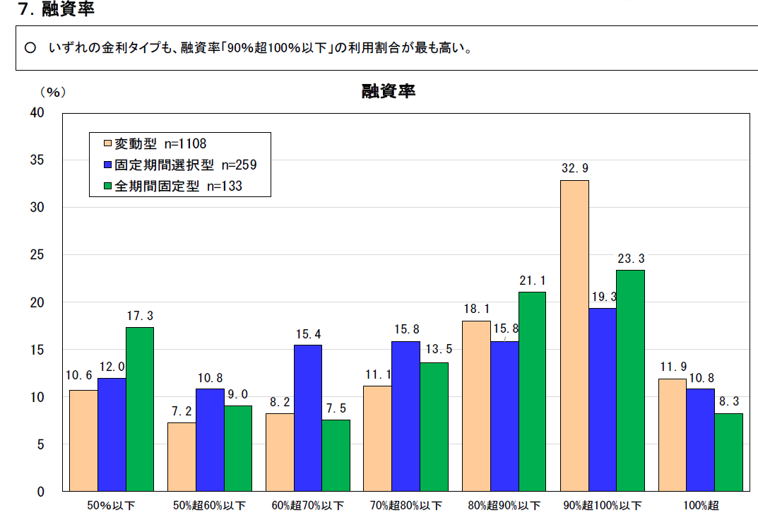 もう少し詳しく見ていきましょう。上は住宅金融支援機構のアンケート調査から見て見ると相対的に金利が低く、金利変動の影響を受けやすい変動金利が73%、特にコロナ後の2020年以降での上昇が目立ちます。そして融資率90%以上が44.8%と半分近く、頭金が小さいあるいは0、そして金利高騰のリスクが高い反面金利の低い変動金利の割合が大きいというのは無理なローンを組んでいる可能性が高くなっています。