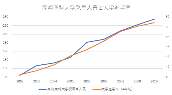 表:2000年代の高崎商科大学駅乗車人員と大学進学率(高崎商科大学前駅@Wikipedia、9.大学入学者数等の推移@文部科学省資料より作成)