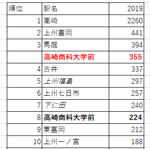 表:高崎商科大学前駅の上信電鉄での利用者数順位(高崎商科大学前駅@Wikipedia、高崎市統計季報より作成斜め字は2018年度)