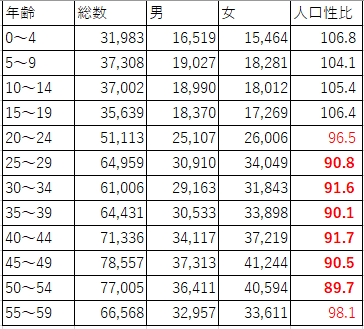 背景には何があったのでしょうか?事件が起こった世田谷区の人口を見るとおかしなことに気付きます。上は世田谷区の人口性比を世代毎に表したもの、20〜24歳で96.5と100を下回り女性の人口が男性のそれを上回ると、20代後半〜50代前半では90前後と男性の人口の1.1倍女性がいる状況となっています。そしてそれが示すのは独身女性の多さであり、同様の事が横浜市青葉区・都筑区でも見られています。