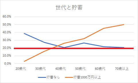 言って見れば年収との相関関係そのものはあるものの全体的に特に40代以上で1000万円以上の資産を築ける人と1文無しの人の2極化が進んでいると言えるのではないでしょうか?