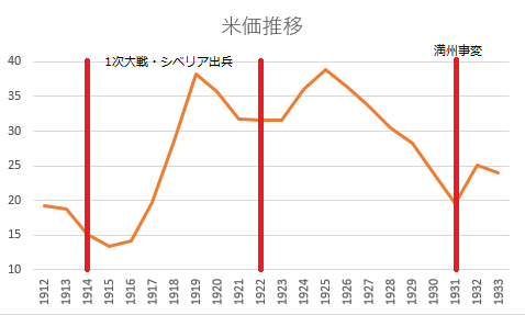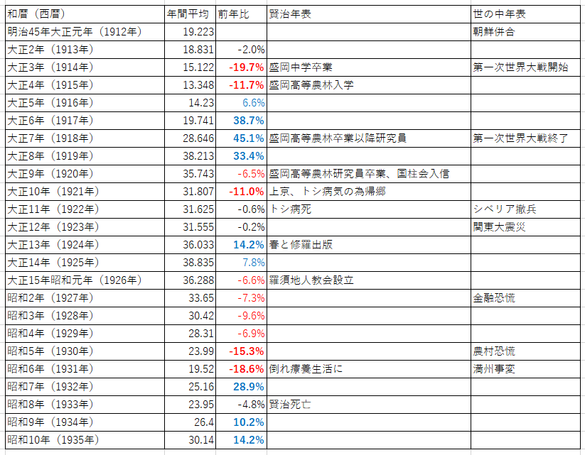 そしてこの時期の米価を見ると対前年比5%以内の変動が23年間で4度と非常に不安定であり、かつ第一次大戦やシベリア出兵、満州事変などの戦争時は高騰、昭和初期などの平時は5%以上の下落が起こると言った感じです。特に賢治が盛岡中学を卒業した大正3年は朝鮮併合で朝鮮半島から安い移入米が入ってくるようになった影響からか20%近い下落が見られます。その後第一次大戦及びシベリア出兵により高騰した為大正後期は1石辺り30円を超える比較的高い値段で推移しますが、平時には下落圧力が高くなることが予想され、政次郎にとってはどこかでこれまでの家業である「農民相手の金融業(質屋)からの脱却」が課題になっていたのではないかと思います。実際映画でも最後は賢治の弟清六によって「脱質屋」を達成し、「結局賢治の言った鉱物を売るのか」と言ったセリフも出て来ています。