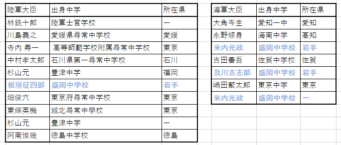 そして徴兵制の話が出たのでもう少し書くと興味深いのは賢治が出た盛岡中学は昭和10年代最も陸軍・海軍大臣を輩出した学校と言う点です。実際満州事変を主導した板垣征四郎陸軍大臣、終戦に奔走した米内光政海軍大臣、近衛内閣で海軍大臣を務めた及川古志郎の3人です。背景には大きな産業が少ない岩手県のエリートにとって軍隊がその能力や夢を託せる場とし存在感が大きかったという事になると思います。