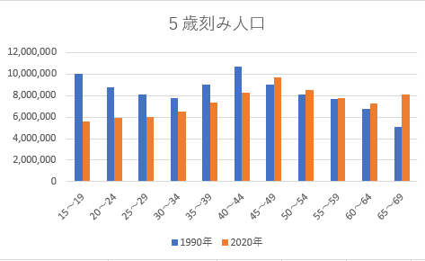 グラフ:平成2年(1990年)、令和2年(2020年)の現役世代の5歳刻み人口(平成2年、令和2年の国勢調査より作成e-statより作成)