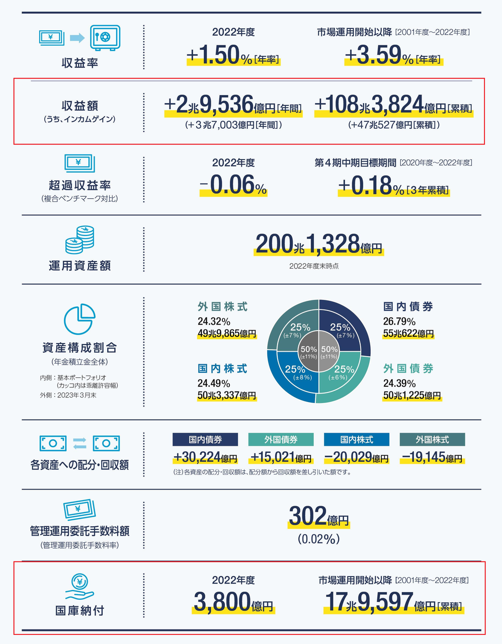 当然対外純資産ではあいまいですがその中で大きな存在感を持つ年金基金を見ると面白い事が分かります。2022年度の収益額は2.9兆円、配当などのインカムゲインは3.7兆円に対し国庫納付は3800億円と収益の20%未満となっています。これは2002年度からの通算でも108兆円に対し18兆円弱とやはり20%未満となります。せめてこれが50%となれば年平均利回り3%として半分で3兆円、今との比較でも2兆円以上使えるお金が増える訳です。その為の大前提としてはこの基金は当然将来の年金支払いの為の大切な資金ですから安易に取り崩すべきお金ではないですし、また政治的な人気取りの為の道具にするのも好ましい事ではないです。ただ少なくとも短期的に政権交代が起こらないであろう政治的に安定している今、将来の年金支払いのためとはいえ、実質活用されていない資産からの配当を活用を検討するのは実質的に現役世代の利益にすらつながらない世代間対立を煽るだけの結論に陥りそうなゼロサムゲームからの脱却を考えると意味のある事に思えます。言うなれば、高齢化でフローの所得が伸び悩んだのを高齢者たちが育ててきたストックからの所得でフォローする、それこそ現役世代と高齢者の対立を緩和し、これからの高齢社会を上手く回す手段と感じるのですがいかがでしょうか?