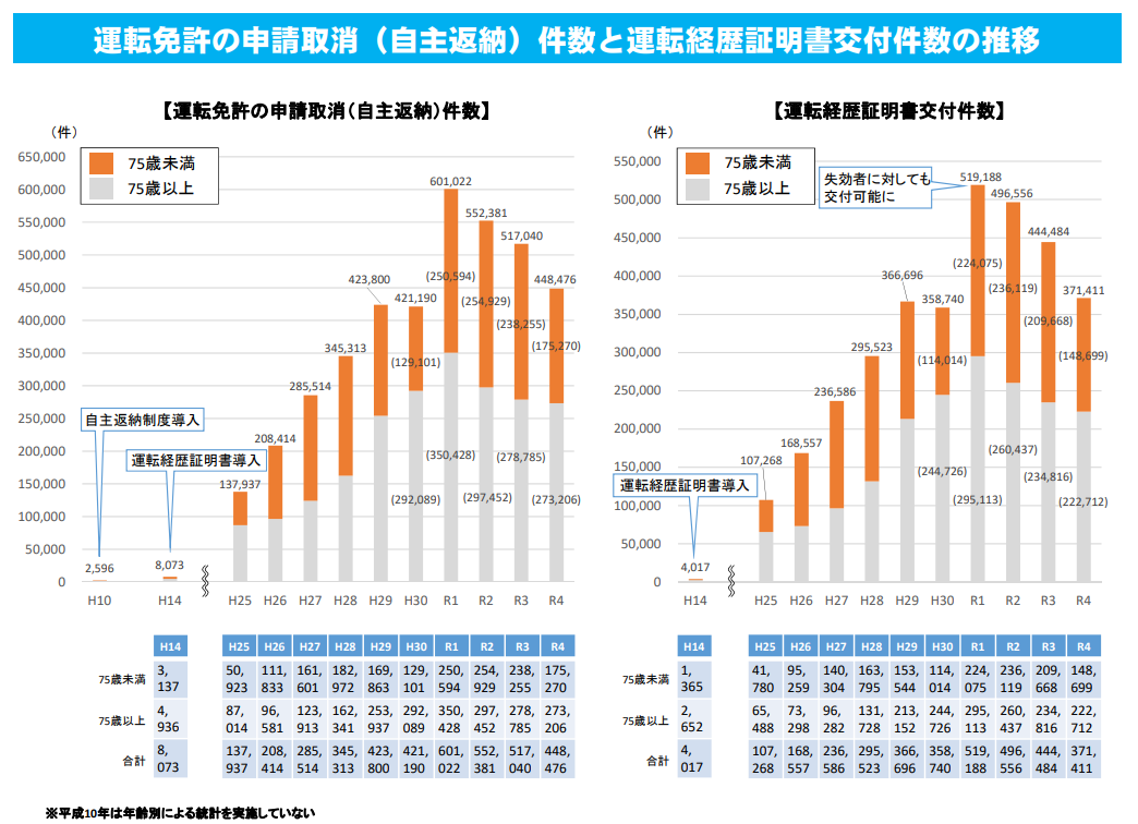 運転免許の申請取消(自主返納)件数と運転経歴証明書交付件数の推移@警察庁